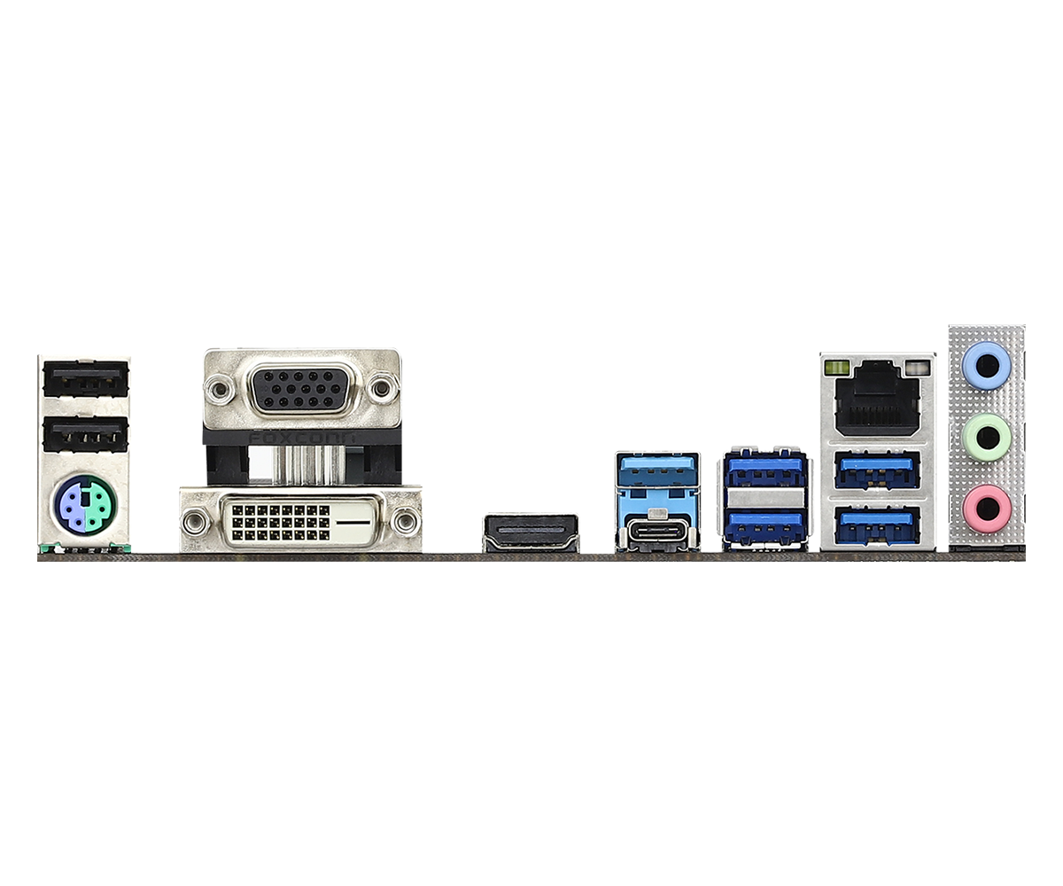 I/O: – 1 x PS/2 Mouse/Keyboard Port; – 1 x D-Sub Port; – 1 x DVI-D Port; – 1 x HDMI Port; – 2 x USB 2.0 Ports (Supports ESD Protection); – 1 x USB 3.2 Gen2 Type-A Port (10 Gb/s) (Supports ESD Protection); – 1 x USB 3.2 Gen2 Type-C Port (10 Gb/s) (Supports ESD Protection); – 4 x USB 3.2 Gen1 Ports (Supports ESD Protection); – 1 x RJ-45 LAN Port with LED (ACT/LINK LED and SPEED LED); – HD Audio Jacks: Line in / Front Speaker / Microphone