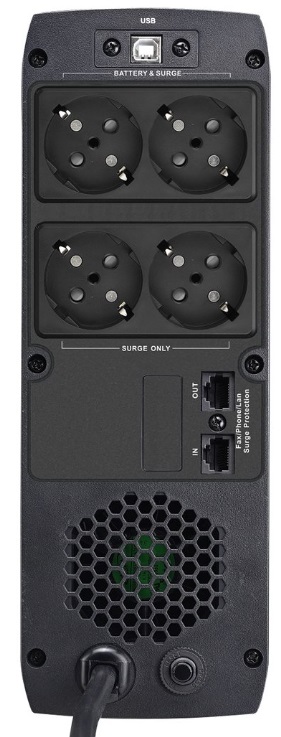 Изход: Voltage:110 / 120VAC or 220 / 230 / 240VAC; AC Voltage Regulation (Batt. Mode):± 5%; Frequency Range (Batt. Mode):60Hz or 50Hz ± 1Hz; Transfer Time:6ms typical, 10ms max; Waveform (Batt. Mode):Simulated Sinewave