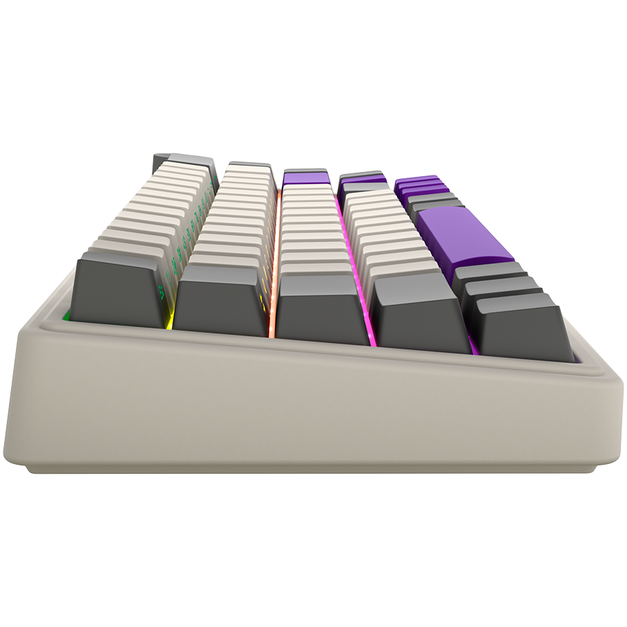 Двуслойни PBT капачки с обозначения отстрани за лесно виждане на вторичните функции. Включени са 6 акцентни клавиша в контрастни цветове (стрелки, Enter и Space), за индивидуален стил. Изчистен външен вид без компромис с функционалността.